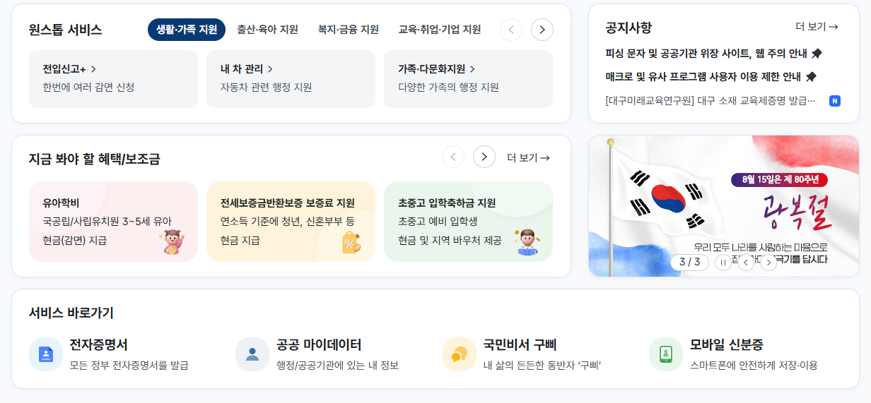 정부24는 단순한 민원 처리뿐 아니라 행정정보 제공, 공공서비스 신청, 마이데이터 활용 등으로 영역이 확장되어 운영되고 있지만, “민원24 홈페이지”로 알려진 민원 기능은 동일하게 유지되고 있습니다.